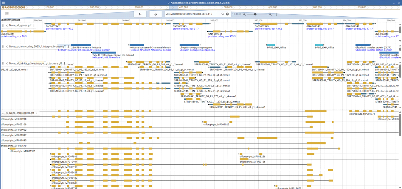 Figure legend: Genome annotation of a green alga. The top tracks display the genome annotation, the middle track shows an independent transcriptome assembly mapped to the genome, and the bottom track shows BUSCO sequences aligned with miniprot.